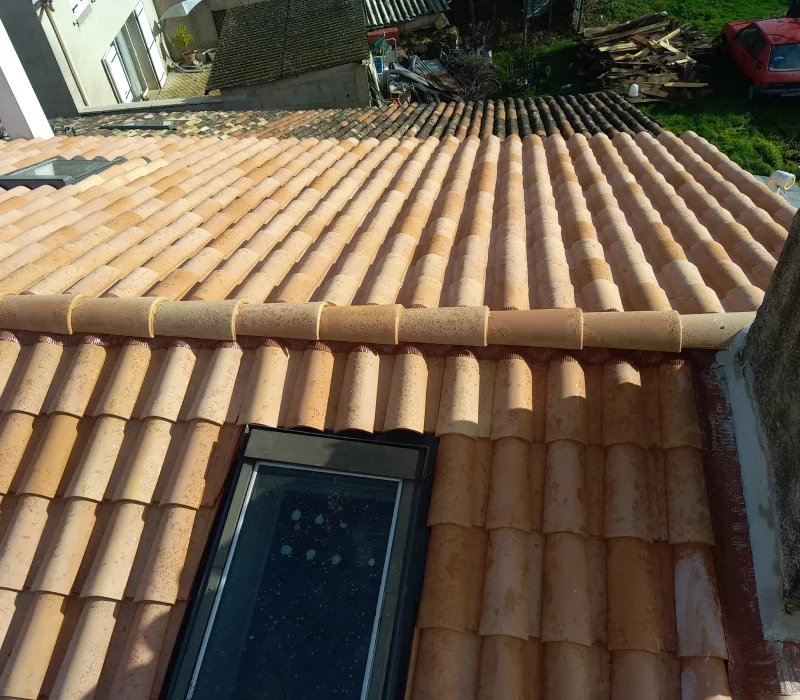 L’intervention commence par une inspection visuelle depuis l’échelle et un contrôle des combles accessibles. Nous listons les priorités — tuiles fracturées, scellements à reprendre, points singuliers à étancher. Après validation :